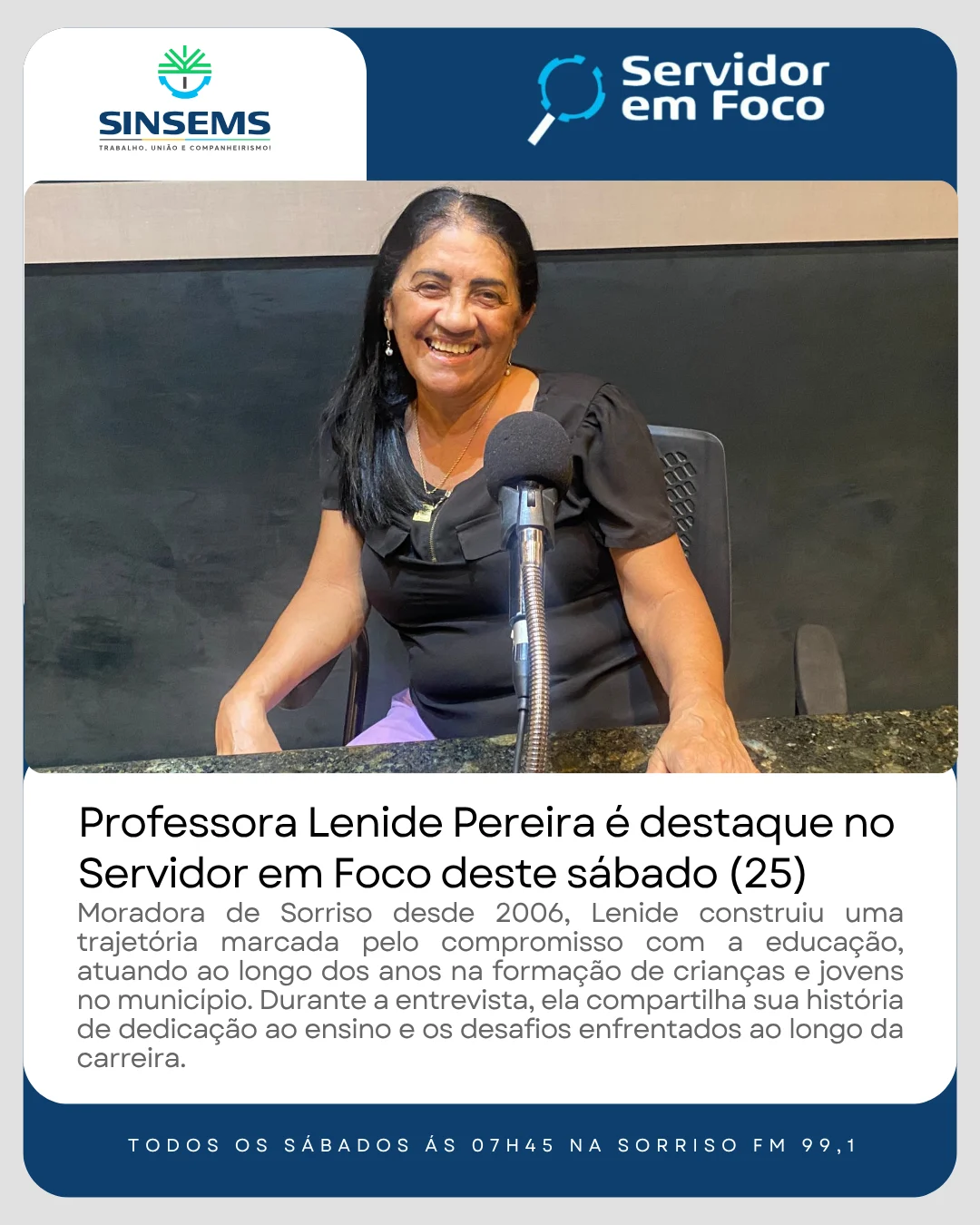 No programa Servidor em Foco deste sábado (25), que vai ao ar às 07h45 pela Sorriso FM, os ouvintes poderão acompanhar uma entrevista especial com a professora Lenide Pereira.
