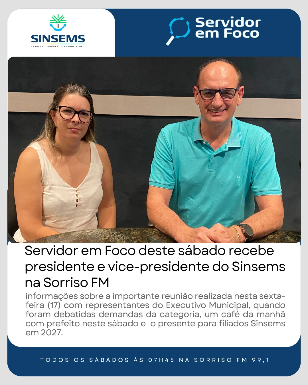 O programa Servidor em Foco, que vai ao ar neste sábado (18), às 7h45, pela Sorriso FM, recebe o presidente do Sinsems, Leocir Faccio, e a vice-presidente Ana Paula Machado Locatelli para tratar de pautas de interesse dos servidores municipais.