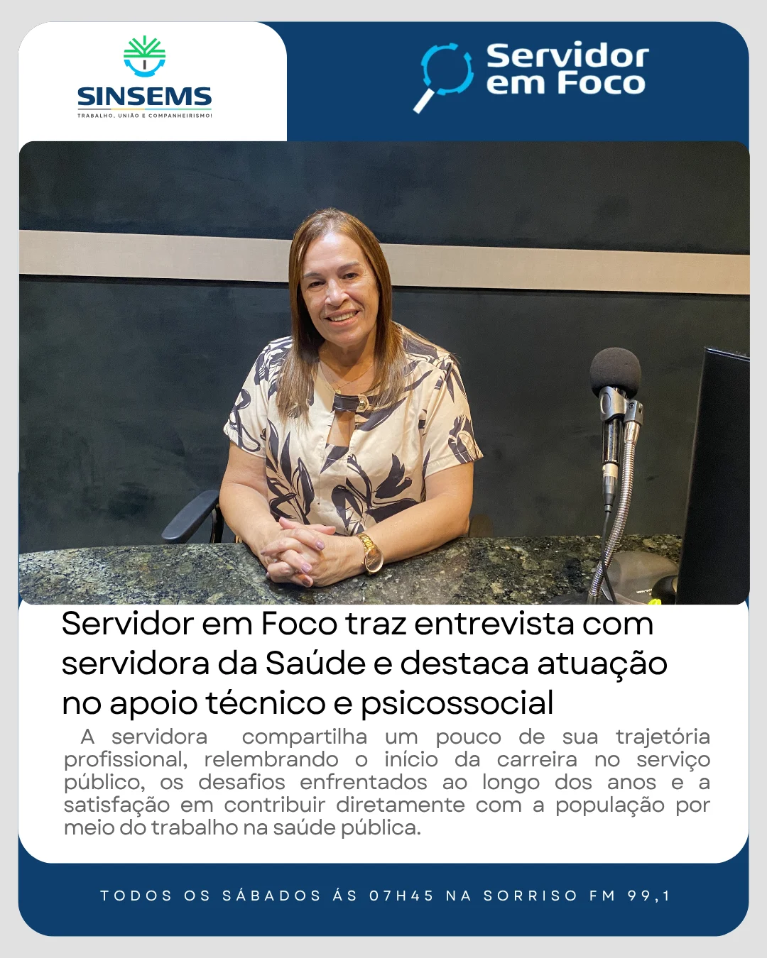 No programa Servidor em Foco deste sábado, a Sorriso FM 99.1 apresenta entrevista com a servidora Ligia Souza Leite, que atua no Núcleo de Apoio Técnico da Secretaria Municipal de Saúde de Sorriso junto à Procuradoria Municipal além de integrar a Rede de Apoio Psicossocial do município.