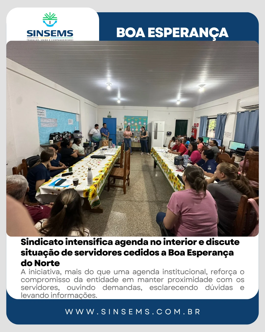 Durante a passagem por Boa Esperança do Norte, a equipe também se reuniu com vereadores do município para tratar da situação dos servidores que atualmente se encontram cedidos. O objetivo foi compreender como estão sendo conduzidas as questões relacionadas à vida funcional desses trabalhadores.