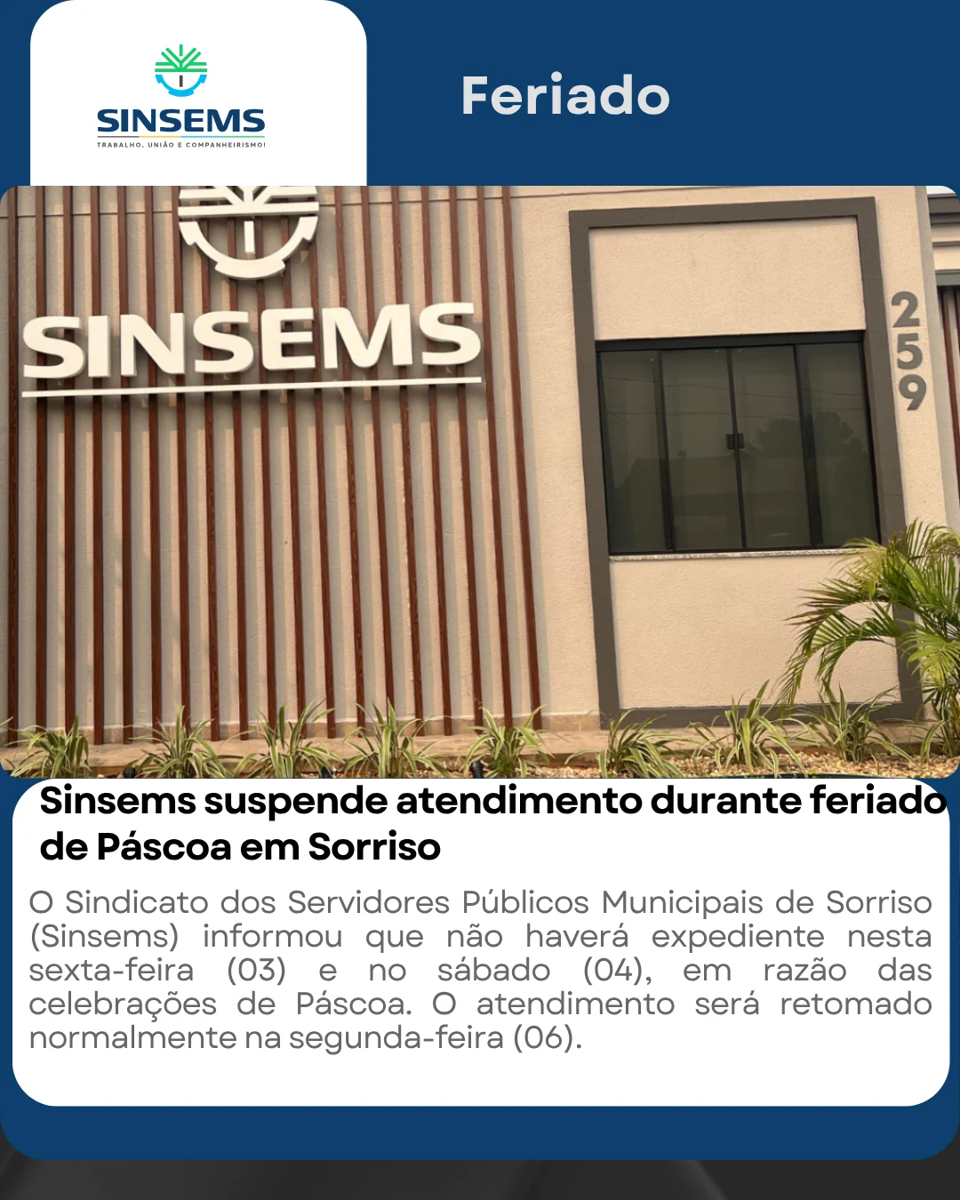 O Sindicato dos Servidores Públicos Municipais de Sorriso (Sinsems) informou que não haverá expediente nesta sexta-feira (03) e no sábado (04), em razão das celebrações de Páscoa.